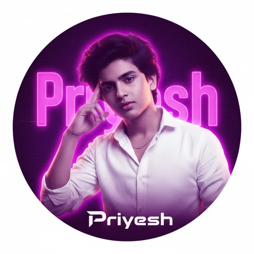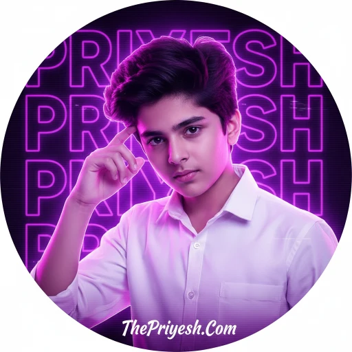 “A circular profile picture design featuring Indian young boy. He is wearing a crisp white button-down shirt and looking intensely at the camera with a serious expression, his right hand raised with fingers touching his temple. The image has a strong monochromatic purple and neon magenta aesthetic. The background features large, translucent block text reading ‘Priyesh’ and a horizontal CRT scanline texture overlay. At the bottom, there is sharp, stylized white text that reads ‘Priyesh’. High contrast, digital fan art style, glowing neon lighting.”
