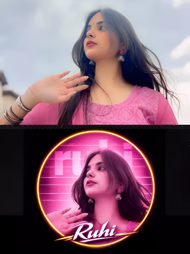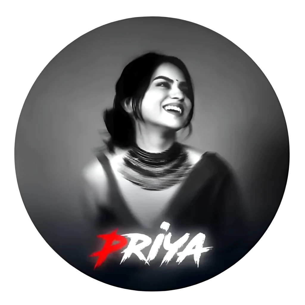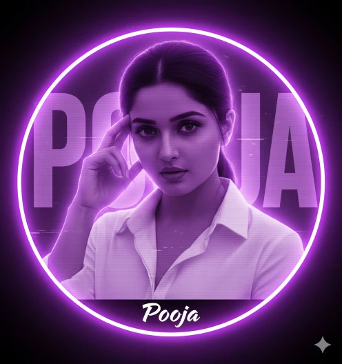 At the bottom inside the circle, sharp stylized white text reads ‘Pooja’, perfectly aligned and fully contained within the circular boundary (no text outside the circle). High contrast, digital fan art style, glowing neon lighting, ultra-detailed face, sharp focus, cinematic glow, modern social media avatar design, 4K resolution.”