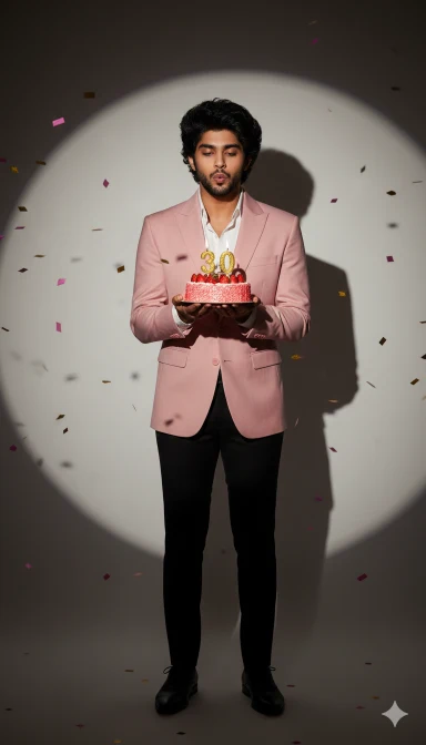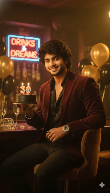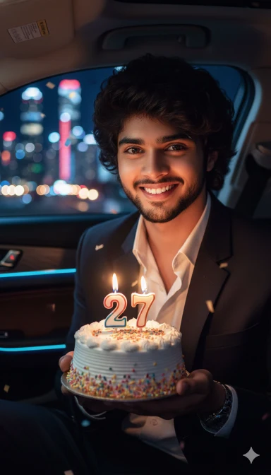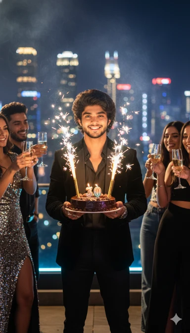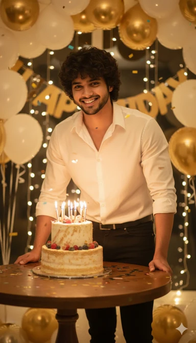 8K ultra HD hyper-realistic cinematic birthday photo of the same young Indian man (same face as reference, no alteration).