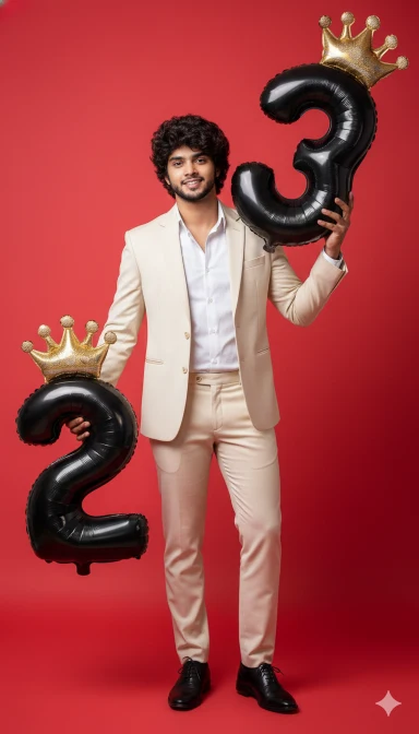 Full-body studio photo of a young man me wearing a sharp cream casual suit with a white shirt, standing in a bright red minimal studio background. He is holding two large glossy black foil balloons shaped like the numbers ‘2’ and ‘3’. The ‘2’ balloon is in his left hand close to the floor, and the ‘3’ balloon is hooked around his right shoulder. Both balloons have golden crown caps on top, giving a premium birthday celebration theme. He wears polished black formal shoes and poses confidently with a modern fashion look. The man’s face and hairstyle must be an exact match to the reference image provided – same beard style, same haircut and same facial details. Lighting should be cinematic, bright, and high-fashion style with sharp contrast Keep my face same 100%same as in the reference image