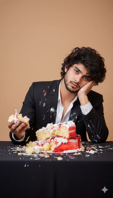 A young man sitting at a table in front of a half-destroyed birthday cake, looking tired and disinterested. He is wearing a stylish black suit jacket over a white dress shirt, slightly unbuttoned. His face and hands are smeared with cake and cream, and he holds a messy handful of cake with a broken candle sticking out. The cake in front of him is smashed, with layers of cream, sponge, and strawberry filling spilling out onto the black table. The background is a plain, warm beige color, giving a minimalist studio look. The lighting is soft and even, highlighting the humorous yet melancholic expression on his face. His posture shows boredom and exhaustion, with one hand resting against his cheek while he stares blankly at the camera. Keep my face same 100%same as in the reference image. Face smile