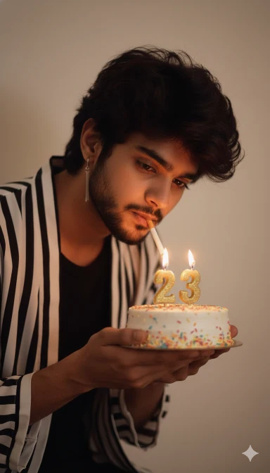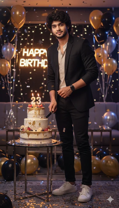 Ultra-realistic 8K cinematic full-body portrait of a 23-year-old Bangladeshi man standing confidently in a modern, stylish lounge, leaning slightly forward with an approachable pose. His face and hairstyle exactly match the uploaded reference image, perfectly styled, looking directly at the camera with a subtle confident smile. He wears a perfectly tailored monochrome blazer over a casual shirt, slim-fit pants, crisp white sneakers, and a smartwatc Directly in front of him is a large, elaborately decorated birthday cake, prominently placed, glowing warmly with “23” candles lit. He holds a cake-cutting knife in his hand, ready to slice the cake. Colorful balloons, shimmering confetti, and vibrant festive decorations surround the scene. Neon lights, fairy lights, and reflective surfac@d dynamic colorful reflections on glass, metal, and plush textures, enhancing the celebratory party atmosphere.Cinematic soft shadows, dynamic depth of field, trendy urban lifestyle vibe, high-fashion smart casual aestoetic, visually captivating, photorealistic textures, ultra-detailed, cheerful and energetic birthday celebration vibe. Camera angle slightly low to emphasize both the man and the large cake, with sparkling confetti gently falling5 around, creating a lively, cinematic birthday scene.