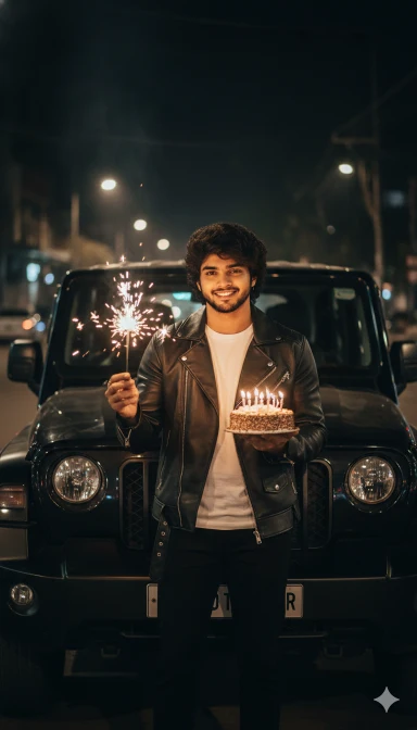 Create a Image and I want 100 percent same face as I uploaded image no alteration, i am man stands in front of a Black THAR at night, holding a lit sparkler in one hand and a small birthday cake with lit candles in the other. He is wearing a black leather jacket, a white t-shirt, and black pants.