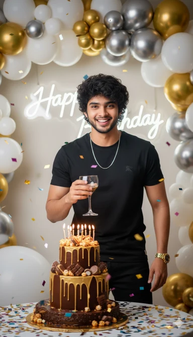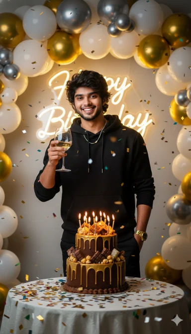 A vibrant birthday celebration photoshoot of a man me standing beside a decorated birthday cake table. He is wearing a casual black Burberry Hoodie, black pants, a golden wristwatch, and a simple chain. He is smiling with joy, holdinga glass in one hand while standing near a two-tier chocolate cake with golden dripping design, decorated with chocolates, popcorns, and candles. The background has white, golden, and silver balloons arranged in a stylish arch with glowing neon ‘Happy Birthday’ sign. Colorful confetti is falling in the air, creating a fun and festive vibe. The man’s face and hairstyle must be an exact match to the reference image provided same beard style, same haircut and same facial details. Lighting should be cinematic, bright, andhigh-fashion style with sharp contrast