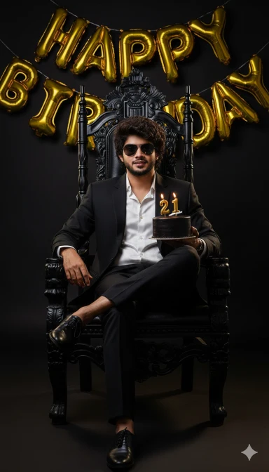 An ultra-realistic, high-detailed editorial birthday photoshoot portrait of a me. And I want 100 percent same face as I uploaded image no alteration, He’s seated relaxed and confidently on a king chair with a solid black background. He is holding a small, sleek black birthday cake in one hand that says “21” with lit candles. Gold “happy birthday” balloons are visible in the background. The man is wearing a black blazer over a fitted white silk shirt and black sunglasses black formal pant and black formal shoes.