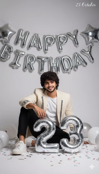 Adivasi studio photoshoot of me (same face & hairstyle as reference), sitting casually on floor in front of silver “HAPPY BIRTHDAY” + star balloons. Wearing cream/black suit, plain white tee, white sneakers. Large metallic silver “23” balloons in front, floor decorated with shiny confetti & balloons. Cinematic bright high-fashion lighting, sharp contrast, fun party vibe.Birthday coming soon 25 October