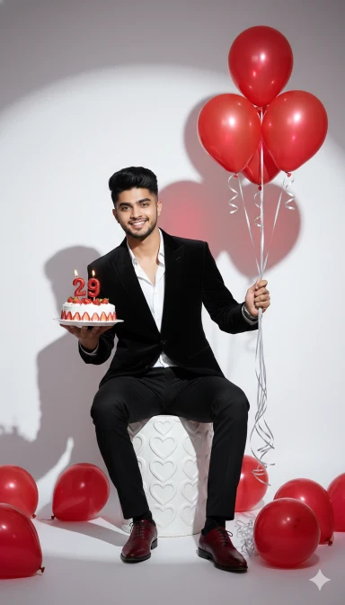 This is a photo of me. Please create a full-body 9:16 vertical birthday portrait of a handsome young man, around 29 years old. He has thick, naturally black hair styled in a clean, modern textured quiff with neatly faded sides, giving a sharp yet natural look. His face is well-groomed with a light stubble beard for a stylish and mature touch. His skin tone is fair, and his features are highlighted by natural, flattering studio lighting. He is wearing a tailored slim-fit black velvet suit jacket with a crisp white shirt underneath, left slightly unbuttoned at the collar for a relaxed birthday vibe. Paired with slim black trousers and polished deep red dress shoes that subtly match the theme. On his wrist, he wears a sleek silver watch. In his left hand, he holds a round white plate with a beautifully decorated strawberry birthday cake topped with fresh strawberries, “29” birthday candles, and tiny red cherry motifs on the icing. In his right hand, he holds a bunch of glossy metallic red balloons with long silver ribbons. Additional red balloons are scattered on the floor for decoration. He sits confidently on a sculpted white pedestal chair with embossed heart patterns, maintaining a relaxed yet elegant pose. The clean white studio backdrop is enhanced by a bright key light from the front and a soft round spotlight behind him, creating a subtle dark halo shadow effect for depth. The overall photography style is clean, high-key, and sharp-focused, emphasizing the rich reds, elegant blacks, and natural skin tones without heavy filters.