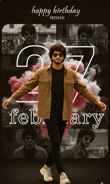 At the top, white script text “Happy Birthday” and smaller white text “PRIYESH”. A large, white outline number “27” dominates the background behind me. A large, white outline number “February” dominates the background position below 27, white “@thepriyesh” logo bottom right. Dramatic studio lighting. 8k resolution. make sure face is 100% match, no light on face, natural face, Behind 27 Strong red and white smoke effect.