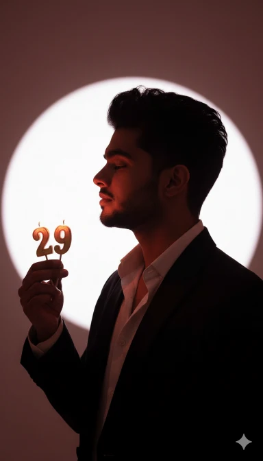 This is a photo of me. Please create a cinematic, hyper-realistic, studio portrait of me. He is in side profile, facing to the left, with his eyes closed and a calm, serene expression. His dark hair is styled in a modern, textured, slightly wavy hairstyle with volume on top, neatly fading at the sides. He is holding two lit candles shaped like the numbers “29” in his right hand, positioned in front of his face. The subject is wearing a tailored, elegant black suit jacket with a crisp white shirt, slightly unbuttoned at the collar for a stylish yet relaxed look. The scene is enveloped in a monochromatic, moody red color palette, with a single, sharp spotlight creating a bright, circular white-to-light-gray backdrop directly behind his head.The Lighting is dramatic and low-key, with strong shadows and high contrast, emphasizing the clean silhouette of his profile. The overall tone is intimate, celebratory, and nostalgic. Shot on a professional digital camera with a wide aperture, capturing a shallow depth of field and beautiful bokeh