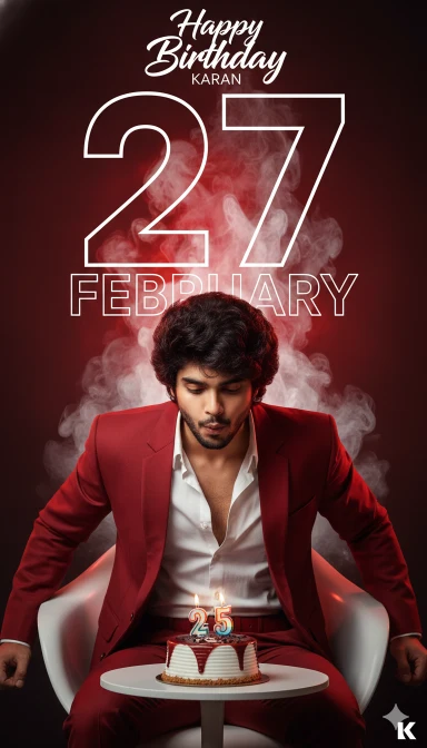 He is wearing a sharp red blazer layered over a crisp white shirt, casually unbuttoned at the top. wear a red belt, completing a classy, modern, and fashionable look. At the top, white script text “Happy Birthday” and smaller white text “KARAN”. A large, white outline number “27” dominates the background behind me. A large, white outline number “FEBRUARY” dominates the background position below 27, white “” logo bottom right. Dramatic studio lighting. 8k resolution. make sure face is 100% match, no light on face, natural face, Behind 27 Strong red and white smoke effect.