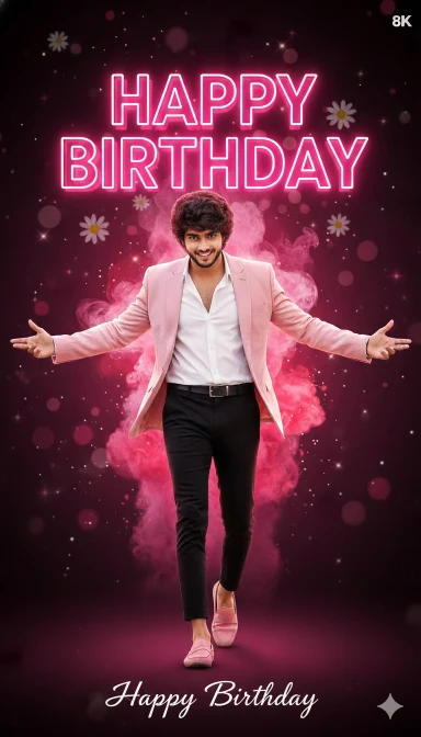 Ultra-realistic 8K birthday poster design.Subject: a person (use uploaded face – 100% facial accuracy, no changes) slight smile.Soft warm light on the face, natural skin texture, no overbrightness.Background:A dramatic dark-to-bright gradient backdrop with deep pink and black lighting, glowing floral bokeh, soft daisy silhouettes, and floating sparkles. Behind the subject, add large 3D glowing text saying HAPPY BIRTHDAY in bold pink neon style with strong backlight glow.Below the subject, add stylish handwritten space for: Design Style:Highly cinematic, glossy editing, sharp edges around the subject, soft pink rim light, beautiful color grading. Add slight vignette for depth.Poster ratio: 4:5 verticalHigh clarity, vibrant colors, premium birthday aesthetic.No watermark, no logos (leave clean for user).me wearing light pink open pink blazer over white open-collar shirt (top buttons undone), black slim cropped trousers, pink loafers. Walking toward camera mid-stride (right leg forward), both arms fully extended sideways with open palms, head slightly tilted right and right, confident playful smile, tousled hair., head slightly tilted down and right, confident playful smile, behind me strong pink and red smoke effect. try different powerful pose of head