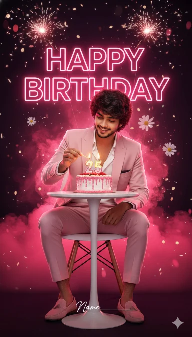 Ultra-realistic 8K birthday poster design.Subject: a person (use uploaded face – 100% facial accuracy, no changes) slight smile. Soft warm light on the face, natural skin texture, no overbrightness.Background:A dramatic dark-to-bright gradient backdrop with deep pink and black lighting, glowing floral bokeh, soft daisy silhouettes, and floating sparkles. Behind the subject, add large 3D glowing text saying HAPPY BIRTHDAY in bold pink neon style with strong backlight glow.Below the subject, add stylish handwritten space for: Design Style:Highly cinematic, glossy editing, sharp edges around the subject, soft pink rim light, beautiful color grading. Add slight vignette for depth.Poster ratio: 4:5 verticalHigh clarity, vibrant colors, premium birthday aesthetic.No watermark, no logos (leave clean for user).me wearing light pink open pink blazer over white open-collar shirt (top buttons undone), pink slim cropped trousers, pink loafers. You are sitting on a modern white chair in front of a small celebration table. A birthday cake with glowing number “2” and “5” candles is placed in the center. me lean slightly forward with a soft smile, holding a matchstick or lighter in your right hand as me carefully light the candles. my left hand rests gently on the table for balance. Crackers sparkle and burst above me in the background, adding a festive and vibrant atmosphere. confident playful smile, tousled hair. Light smile, behind me strong pink and red smoke effect.