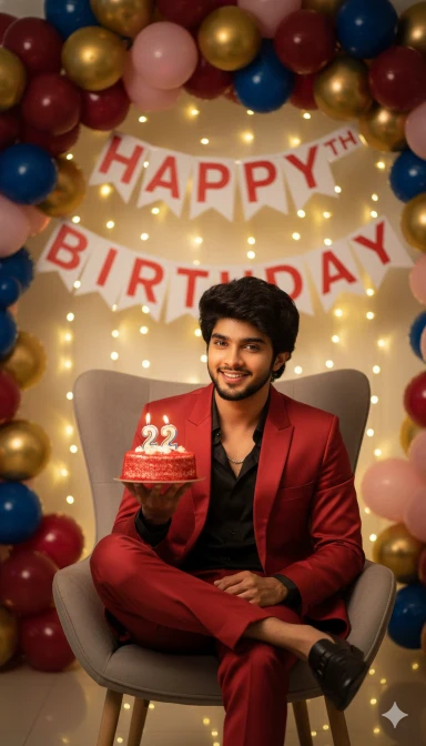 Creat an 8K ultra realistic birthday celebration picture featuring attached young man my same face with trimmer beard, silver chain sitting, crossing one leg over another gracefully, in a stylish red satin suit. He has short dark wavy hair and is holding a red birthday cake with candles lit. The background is adorned with an arch of red and colour full balloons, fairy lights, and a ‘Happy 22th Birthday’ banner, creating a festive atmosphere. The lighting is soft