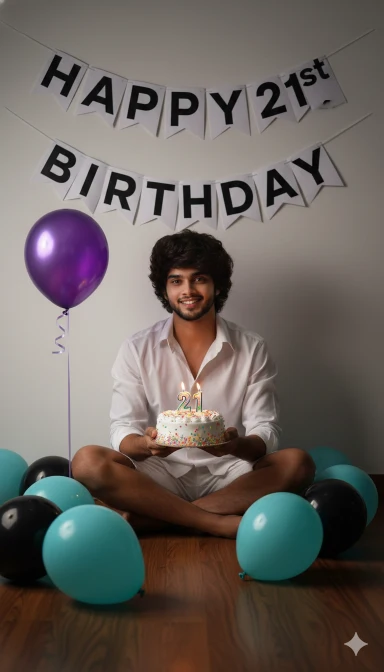 Create a realistic image and i want 100 percent same face as I uploaded image no alteration. I am wearing a white collared shirt, sits on the floor amidst a scattering of balloons (some black, some light blue/teal). They hold a small, round birthday cake topped with colorful sprinkles and a lit candle with the number “21” on it. A purple balloon is tethered nearby, and a “HAPPY 21ST BIRTHDAY” banner hangs on the wall behind them. The lighting is dim, casting shadows from the banner onto the white wall.
