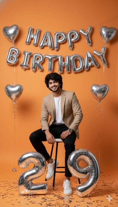 Background: Solid warm orange studio backdrop. On the wall behind him, silver metallic balloon letters spelling “HAPPY BIRTHDAY”, arranged in a soft curved layout. Small silver heart-shaped balloons floating on both sides for decoration.