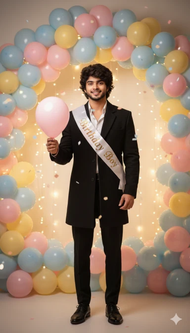 Create a stylish portrait of me wearing black coat pant in front of a balloon-filled backdrop, wearing birthday sash, glowing lights and pastel tones.