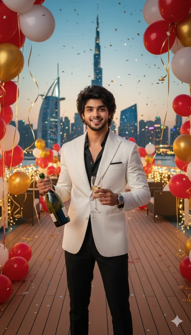 Create a cool dude birthday portrait of me, holding Champaign on cruise ship, beautiful dubai building in background and entire ship decorated with balloons