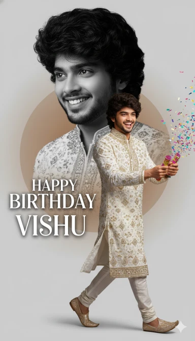 Create a modern fashion campaign poster featuring me with a split-personality concept. stylish boy (refrence image given)Main full-color figure walking right, treditional white fully worked kurtha dress, both hand party pop, joy full expression. Behind me, a large black-and-white portrait facing slightly left,joyfull, mysterious, ” HAPPY BIRTHDAY VISHU . Light gray background with warm circular gradient (soft brown/beige) stylish