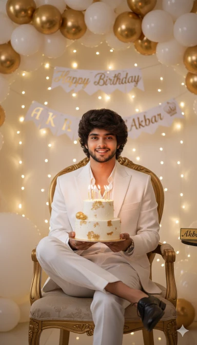 Creat an ultra realistic 55mm birthday celebration picture featuring attached young boy sitting, crossing one leg over another gracefully, in a stylish white satin suit. He has short dark wavy fringe hair and is holding a white birthday cake with candles lit. The background is adorned with an arch of white and gold balloons, fairy lights, and a ‘Happy Birthday’banner, Akbar,creating a festive atmosphere. The lighting is soft and warm name plate Akbar.