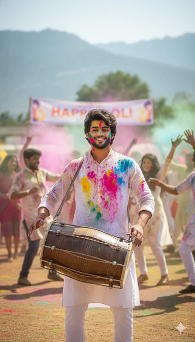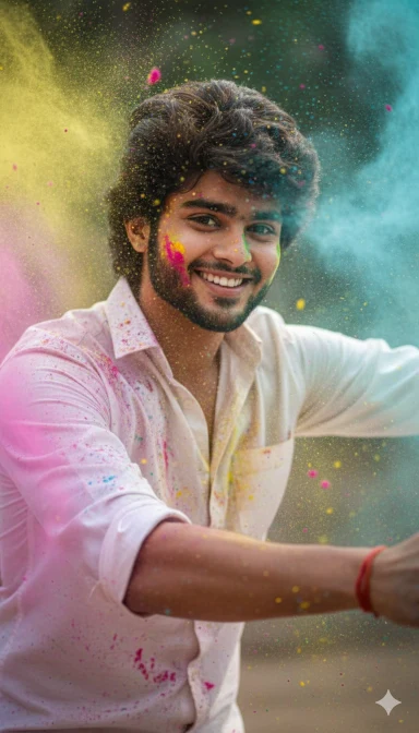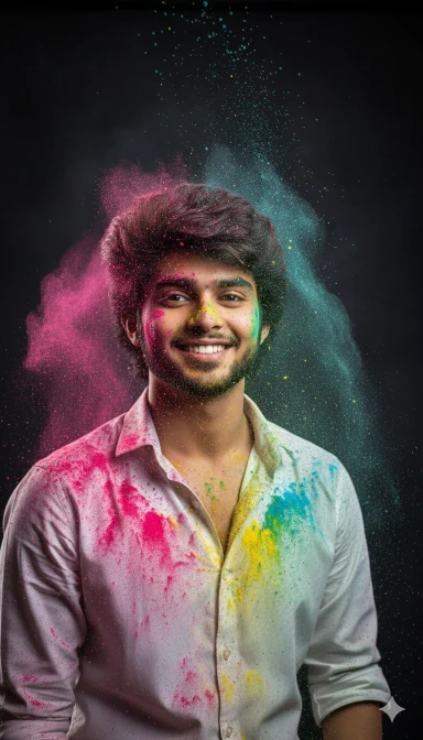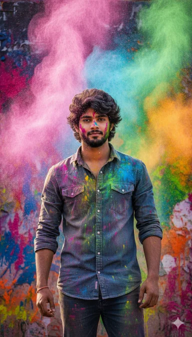 A slow-motion-style cloud of colorful Holi powder floats around him, with realistic depth, motion blur, and particle separation, giving a lively festival vibe without overdoing the colors.