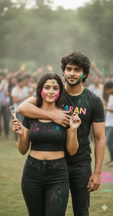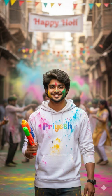 The face in it will be yours. You can also create couple Holi pictures with this prompt. And you can also add names to some photos. This is most important, because people are liking name pictures a lot these days.