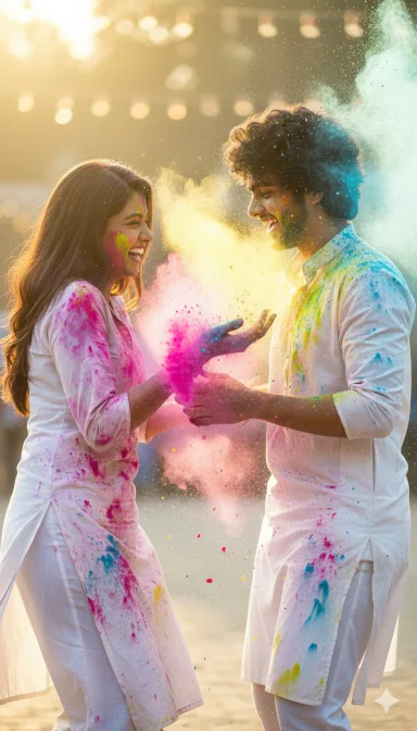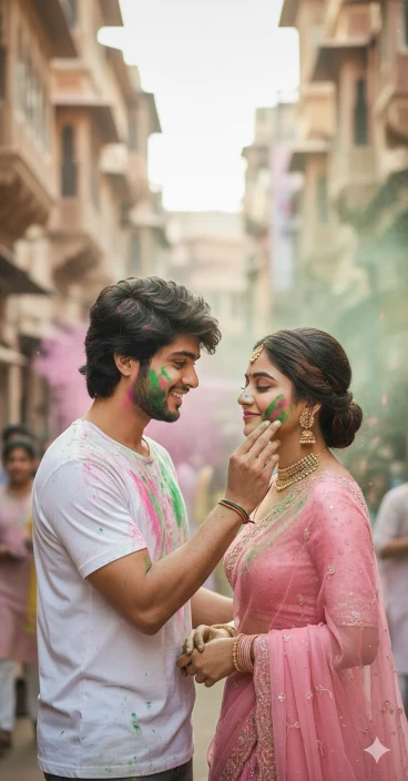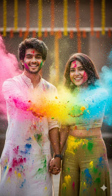 Ultra-HD 4K clarity, high dynamic range, vibrant yet balanced color grading, subtle cinematic film grain for texture, smooth motion blur on flying powder particles, romantic yet energetic Holi mood.