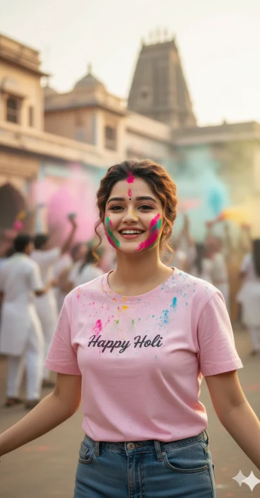 The girl is wearing a modern casual outfit, a light pink t-shirt with clear text “Happy Holi” written on it.