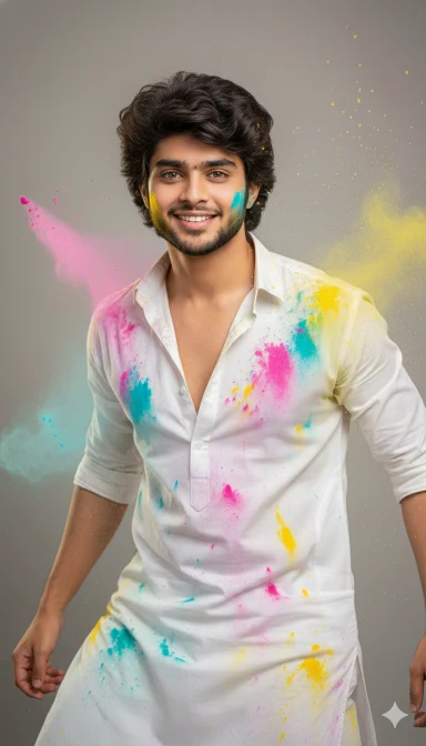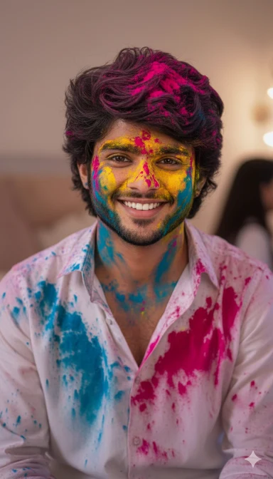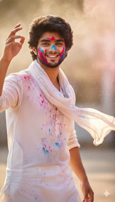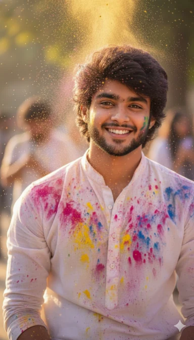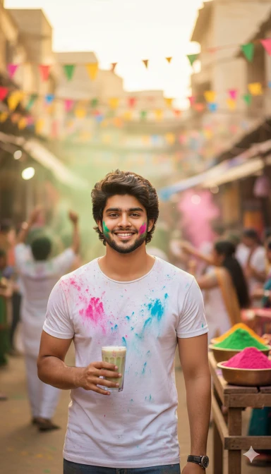 Outfit: Casual modern t-shirt with a name printed (optional), lightly splashed with natural Holi colors.