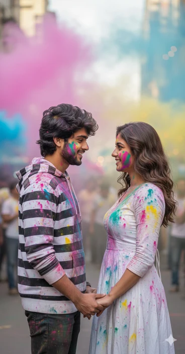 Create a realistic, cinematic Indian Holi celebration scene with a stylish young couple.