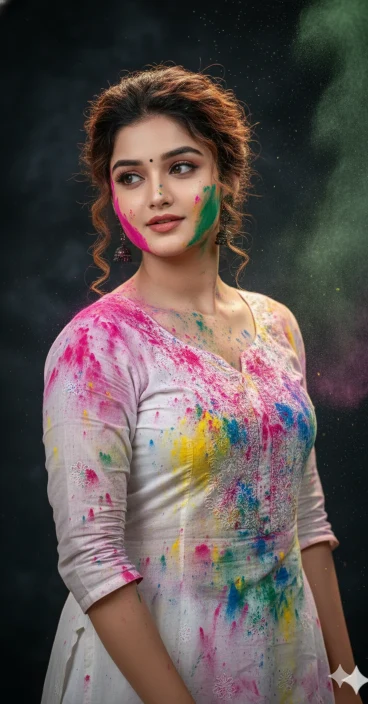 Ultra-HD 4K quality, cinematic Holi vibes, vibrant yet balanced color grading, pop contrast, natural skin texture with fine details, editorial fashion photography feel, trending Instagram aesthetic.