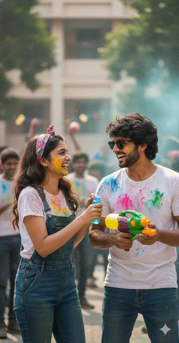 Scene: A joyful Holi celebration in an Indian college campus courtyard, lively crowd in the background, people playing with colors and water balloons.
