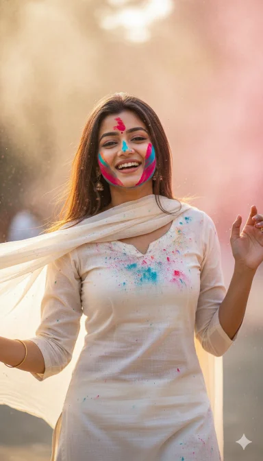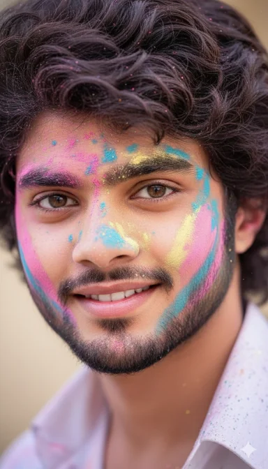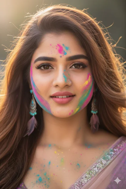 Face & Details: Natural Holi colors on cheeks and forehead, realistic skin texture, no artificial smoothness.