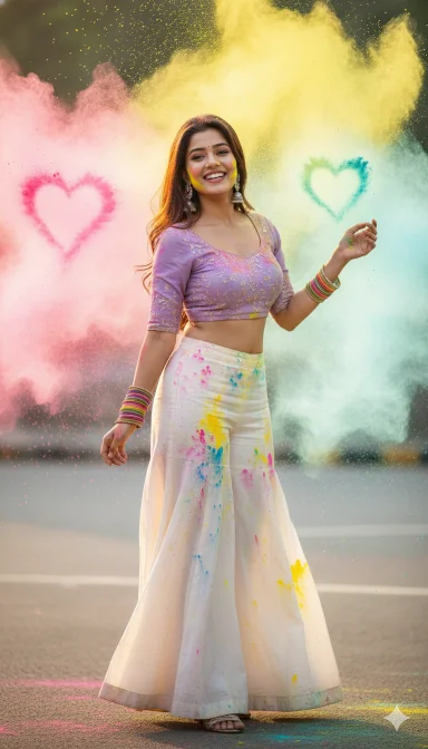 Create an ultra-realistic, cinematic full-body portrait of a young woman celebrating Holi in trendy attire (crop top, palazzo, stylish accessories). Vibrant Holi powder swirls around her in soft heart-shaped patterns, captured mid-air with natural motion.
