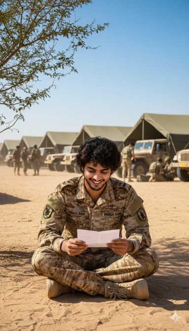 A young male soldier in camouflage military uniform sitting on sandy desert ground under a small tree, smiling while reading a letter. The name tag on his uniform reads “PRINCE RAM.” Behind him, there are green military tents, army trucks, and several other soldiers in similar uniforms preparing for duty or walking around the camp. The scene is bright and sunny with a clear blue sky, creating a warm, desert military camp atmosphere. The mood is positive and heartfelt, showing a soldier enjoying a personal moment amid duty.