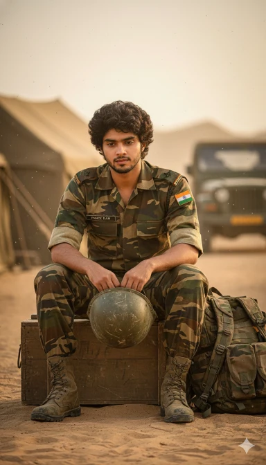 IMPORTANT – FACE LOCK Keep the subject’s real face exactly the same as the uploaded reference image. Do NOT change facial structure, jawline, eye shape, nose, lips, skin tone, beard, hairline, age, or expression. Maintain 100% identity accuracy. No beautification, no face swapping, no AI alteration. Preserve natural skin texture, pores, asymmetry, and imperfections. The person must be instantly recognizable as the same individual.ASPECT RATIO • 3:4 verticalCreate a hyper-realistic cinematic HD photograph of a young Indian Army soldier resting after duty inside an army camp.SUBJECT: Young Indian man in Indian Army uniform. Uniform slightly worn, dusty from duty. Name badge reads “Prince Ram”. Indian flag badge visible on uniform.POSE & BODY LANGUAGE: The soldier is sitting on a wooden army crate. One elbow resting on his knee. Other hand loosely holding his helmet. Upper body slightly leaned forward. Pose feels calm, thoughtful, and grounded. Shows the human side of a soldier after duty.FACIAL EXPRESSION: Face perfectly clear and detailed. Natural skin texture preserved. Eyes slightly lowered, thoughtful gaze. Expression calm, composed, emotionally strong. No blur, no artificial glow.FOOTWEAR & GEAR: Army boots planted firmly on sandy ground. Helmet placed in hand. Backpack resting beside him.BACKGROUND & ENVIRONMENT: Inside an operational army camp. Canvas tents behind him. Military jeep parked at a distance. Soft dust particles in the air. Quiet evening camp atmosphere.LIGHTING: Soft natural evening light. Warm but realistic tones. Gentle shadows. Cinematic realism.CAMERA & STYLE: DSLR documentary photography style. Medium-close framing. Shallow depth of field.