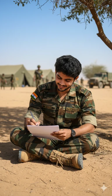 There is a young man who is wearing the uniform of the Indian Army in the desert and Prince Ram is written on his badge and there is an Indian flag badge on his dress and wearing boots on his feet, he is sitting under the shade of a tree and writing a letter and there is a tent etc. behind him and this is the atmosphere of an army camp, this photo is a close-up, it is a completely realistic photo.