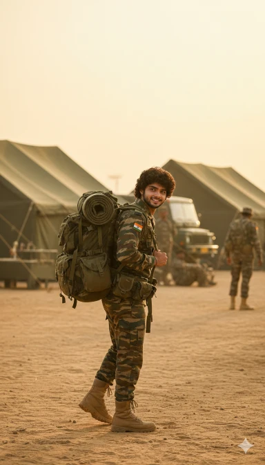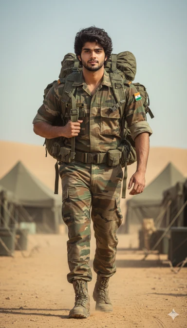 IMPORTANT – FACE LOCK Keep the subject’s real face exactly the same as the reference image. Do NOT change facial structure, jawline, eyes shape, nose, lips, skin tone, beard, hairline, age, or expression. Maintain 100% identity accuracy. No beautification, no face swapping, no AI alteration. Preserve natural skin texture, pores, asymmetry, and imperfections. The person must be instantly recognizable as the same individual.ASPECT RATIO • 3:4 verticalA completely ultra-realistic cinematic close-up photograph of a young Indian Army soldier inside a desert army camp.SUBJECT: A young Indian man wearing an authentic Indian Army combat uniform. Uniform shows realistic desert dust, fabric creases, and wear. A name badge on the chest clearly reads “Prince Ram”. An Indian tricolor flag badge is stitched on the uniform sleeve.POSE & ACTION: The soldier is walking forward slowly through the camp, carrying a heavy military backpack on his shoulders. One hand holding the backpack strap firmly, the other arm relaxed. Posture shows calm confidence and quiet strength.FOOTWEAR: Original Indian Army combat boots, dust-covered, realistic sole texture, natural wear.ENVIRONMENT & BACKGROUND: Desert army camp setting. Canvas military tents visible behind him. Sandy ground with footprints. Soft desert haze in the distance. Clear open sky with muted sunlight.CAMERA & COMPOSITION: Close-up to medium framing. Face perfectly sharp and in focus. Background softly blurred for cinematic depth. Professional DSLR photography look.LIGHTING: Natural desert daylight. Soft highlights on the face. Balanced shadows, no harsh contrast.STYLE & QUALITY:
