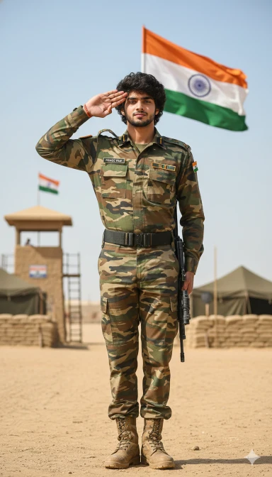 IMPORTANT – FACE LOCK Keep the subject’s real face exactly the same as the uploaded reference image. Do NOT change facial structure, jawline, eye shape, nose, lips, skin tone, beard, hairline, age, or expression. Maintain 100% identity accuracy. No beautification, no face swapping, no AI alteration. Preserve natural skin texture, pores, asymmetry, and imperfections. The person must be instantly recognizable as the same individual.ASPECT RATIO • 3:4 verticalCreate an ultra-realistic cinematic HD photograph of a young Indian Army soldier standing at a border checkpoint.SUBJECT: Young Indian male wearing full Indian Army combat uniform. Uniform shows realistic stitching, dust marks, and fabric folds. Name badge clearly visible reading “Prince Ram”. Indian tricolor flag patch stitched on the shoulder.POSE & BODY LANGUAGE: The soldier is standing upright in a formal salute pose. Right hand raised sharply to the forehead in perfect military salute. Left hand resting straight by the side. Feet firmly grounded, posture straight and disciplined. Pose reflects respect, duty, and national pride.FACIAL DETAILS: Face extremely sharp and clear. Natural skin texture with visible pores. Eyes focused straight ahead. Calm, serious, disciplined expression. No blur, no smoothing, no editing.FOOTWEAR & GEAR: Authentic Indian Army combat boots with light dust. Tactical belt visible. Rifle slung on the back with strap across shoulder.BACKGROUND & ENVIRONMENT: Border army post setting. Watchtower visible behind. Sandbags stacked near the post. Indian national flag fluttering in the background. Dry desert terrain with distant hills.LIGHTING: Natural daylight. Balanced highlights on face. Soft shadows. Realistic outdoor exposure.CAMERA & QUALITY: Professional DSLR look. Medium portrait framing.