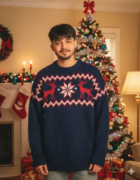 “Convert reference image into a 1990s Christmas movie still. Oversized navy sweater with retro reindeer pattern. Background: decorated living room, bright lights, heavy tinsel, VHS-style grain, subtle scratches, warm tones. Keep face accurate.”