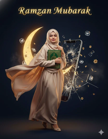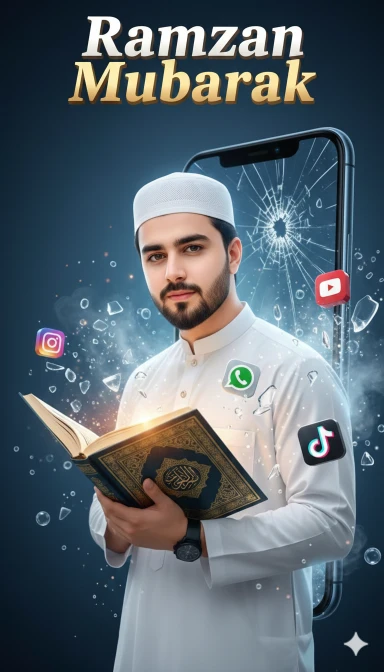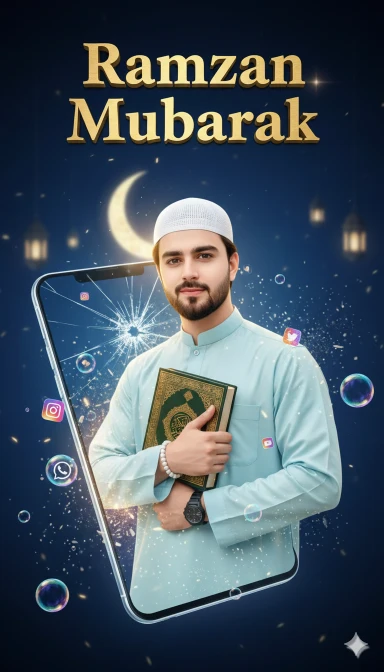 IMPORTANT – FACE LOCK (ABSOLUTE & NON-NEGOTIABLE) Uploaded reference image must be the ONLY identity reference. Maintain 100% identity accuracy: Same facial proportions Same hairline Same skin tone Same real expression Same human detail No beautification No face swap No AI modification No animated skin Face must appear completely natural and human. SCENE DESCRIPTION Ultra-realistic cinematic digital scene. A young Muslim boy stepping forward through a glowing smartphone screen portal. The phone is tilted slightly, glass cracked dramatically with light rays shining from inside. He wears: • Soft pastel kurta (light sky blue) • White prayer cap (topi) • Simple wrist tasbih beads He holds the open Qur’an close to his chest. Floating around him: Broken holographic social media icons dissolving into particles. Glowing digital fragments fading into light dust. Crystal bubbles reflecting Ramadan lantern shapes. BACKGROUND Deep blue Ramadan night gradient background. Subtle crescent moon glow behind him. Soft floating lantern bokeh in distance. Gentle smoke and light particles. EXPRESSION Serene Spiritual Mature calm Slight soft smile LIGHTING Cool blue ambient tone. Warm golden highlight from Qur’an pages. Soft rim light outlining cap and shoulders. Natural skin illumination. CAMERA & QUALITY Vertical mid-to-full body framing. 35mm cinematic lens. Ultra sharp focus on face. True-to-life skin texture. 8K HDR photorealistic quality. No artificial rendering look. TEXT ELEMENT Add bold cinematic Ramadan headline: “Ramzan Mubarak” Style: Gold embossed look Soft glow Elegant Islamic font style Placed near upper center Clearly readable NEGATIVE PROMPT (STRICT) AI face look, cartoon texture, anime style, plastic skin, distorted body, unrealistic lighting, fake glow, oversaturated colors,