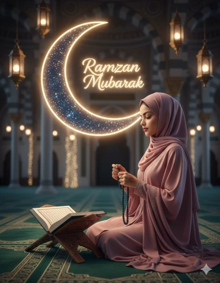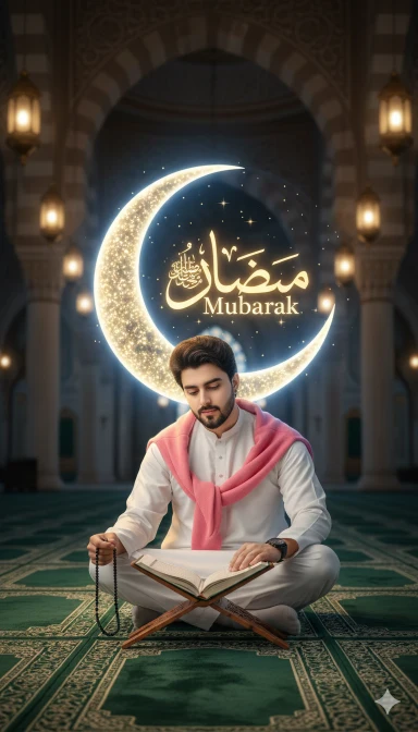Scene: A peaceful grand mosque interior with elegant Islamic arches and soft glowing lanterns. A large luminous crescent moon behind the subject filled with a starry night sky. Magical but realistic atmosphere.