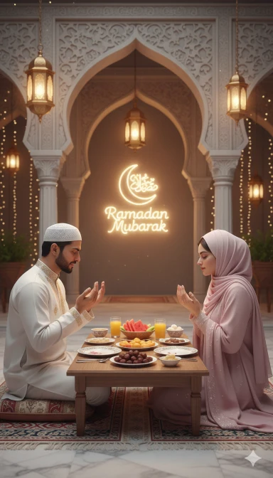 A beautifully decorated Ramadan evening setup inside an elegant Islamic courtyard with arches and warm lantern lights. Soft glowing fairy lights in the background. A subtle neon-style “Ramadan Mubarak” sign with a crescent moon behind them (soft glow, not overpowering).Pose:
