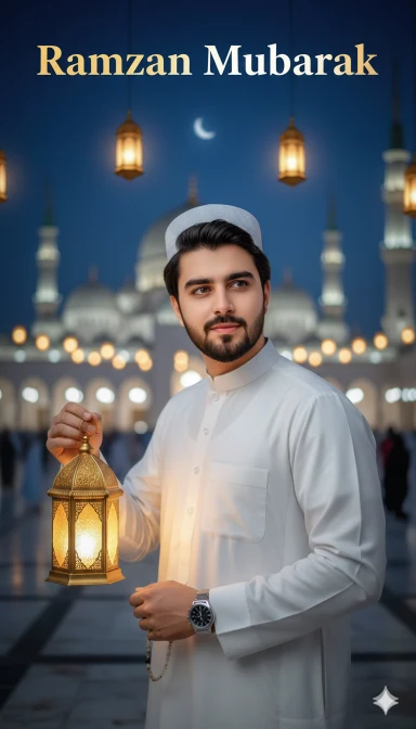 Create an ultra-realistic, cinematic Ramadan themed portrait using the uploaded reference photo.