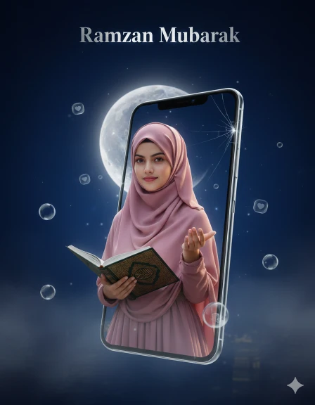 IMPORTANT – FACE LOCK (ABSOLUTE & NON-NEGOTIABLE) The uploaded reference image must be the ONLY facial source. Maintain 100% identity accuracy: • No facial reshaping • No smoothing • No symmetry correction • No beautification • No stylization Real human skin texture must remain visible. Natural lighting response on cheeks and forehead. Authentic identity preservation. SCENE DESCRIPTION Ultra-realistic Ramadan night concept. The woman is emerging from a floating holographic smartphone frame suspended in the air. This version has a cool-toned theme. Hijab color: Soft dusty rose silk hijab with subtle fabric folds and weave detail. She holds an open Quran, pages slightly glowing under moonlight, Arabic script crisp and readable. Pose: She stands half outside the screen. One hand supporting Quran. Other hand slightly extended outward as if offering peace and blessings. EXPRESSION Calm Gentle Spiritual confidence Subtle smile Eyes softly focused forward BACKGROUND Deep royal blue sky. Large crescent moon glowing softly behind her head. Translucent floating crystal bubbles reflecting city lights. Minimal floating social icons in subtle transparent glass form (not cartoonish). Soft silver smoke and moonlight haze. Color palette: Royal blue + silver + soft rose highlights. LIGHTING Cool moonlight key light from upper left. Soft warm bounce light on opposite side. Natural shadow depth. No exaggerated fantasy glow. Realistic skin reflection. CAMERA & QUALITY Medium portrait framing Eye-level composition 85mm prime lens Ultra HD 8K Crisp focus on face Fine detail in hijab texture No AI softness TEXT ELEMENT Place text at top center: Ramzan Mubarak Style: Silver metallic text Subtle glow Elegant modern Islamic typography Cinematic bold appearance NEGATIVE PROMPT (STRICT) AI face, cartoon style, anime look, plastic skin, CGI render, artificial smoothing, distorted anatomy, extra fingers, unrealistic reflections, watermark (except signature), low resolution, blur on face.