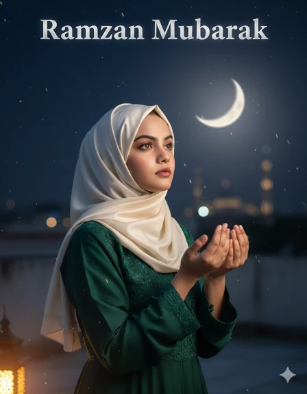 IMPORTANT – FACE LOCK (ABSOLUTE & NON-NEGOTIABLE) Use the uploaded reference image as the ONLY facial identity source. Face must match 100% exactly: • Same bone structure • Same jawline • Same cheek contour • Same eye shape and spacing • Same nose and lip structure • Same skin tone • Same natural expression • Same hairline Do NOT beautify. Do NOT smooth skin. Do NOT modify facial symmetry. No AI reinterpretation. Preserve: Natural pores Real skin texture Subtle imperfections Authentic human lighting response Identity accuracy has highest priority. SCENE DESCRIPTION Ultra-realistic cinematic Ramadan night portrait. A young Muslim woman standing on a rooftop terrace under a large glowing crescent moon. She wears a soft ivory silk hijab and a deep emerald abaya with subtle embroidery details visible in 8K clarity. Pose: She stands slightly turned sideways. Both hands raised gently in dua. Head slightly tilted upward toward the moon. Body posture calm and composed. The wind lightly moves the edge of her hijab for natural realism. EXPRESSION Peaceful Emotionally spiritual Soft closed-lip smile Eyes gently lifted toward sky Serene Ramadan mood BACKGROUND Night skyline with distant mosque silhouette. Soft glowing minarets in background. Star-filled sky with realistic depth. Large crescent moon casting cool silver light. Subtle floating dust particles illuminated by moonlight. Color palette: Deep navy + silver moonlight + emerald tones. LIGHTING Primary cool moonlight from upper right. Soft warm lantern glow from lower left. Natural shadow falloff. No artificial HDR glow. True photographic lighting behavior. Skin must look human, not rendered. CAMERA & QUALITY 85mm prime lens realism Shallow depth of field Face ultra sharp Background softly separated naturally No fake blur 8K resolution True DSLR quality No overprocessing TEXT ELEMENT Top center text: Ramzan Mubarak Style: Elegant bold serif typography Soft silver gradient Subtle glow Premium cinematic placement NEGATIVE PROMPT (STRICT) cartoon, anime, CGI skin, 3D render look, plastic texture, beauty filter, oversharpening, artificial glow, face swap error, distorted hands, extra fingers, low resolution, watermark (except signature), logo distortion, unnatural lighting, AI smooth skin.