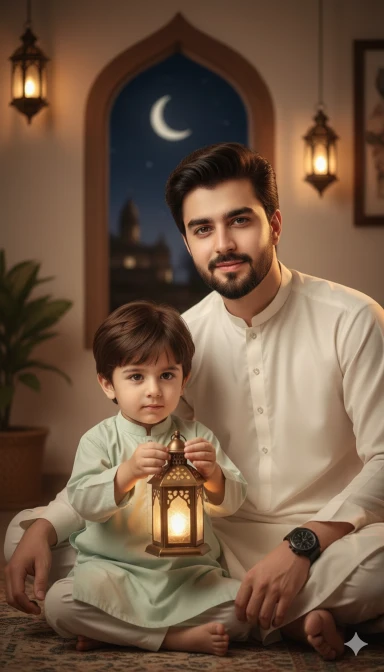 IMPORTANT – FACE LOCK (ABSOLUTE & NON-NEGOTIABLE) Keep the subject’s real face exactly identical to the uploaded refreshed reference image. Do NOT change facial structure, jawline, eyes shape, eyelids, eye distance, nose shape, lips, beard pattern, hairline, age, or expression. Maintain 100% identity accuracy. No beautification, no face reshaping, no AI facial correction. Preserve real human skin texture, pores, fine lines, uneven tone, tiny blemishes, asymmetry. Face realism has higher priority than lighting, pose, color, or background. Face must look naturally imperfect like a real DSLR photo, NOT stylized, NOT smooth. SCENE DESCRIPTION Ultra-realistic human documentary-style Ramadan scene of a real father and child sitting together indoors, captured like a raw DSLR photograph, not cinematic art, not AI-generated look. SUBJECTS (BOTH 100% HUMAN) Father (Reference Face 1): • Exact same face from refreshed image • Natural beard texture, individual hair strands visible • Wearing plain off-white galabeya • Sitting relaxed, shoulders slightly forward • Soft natural smile (not posed) Child (Reference Face 2): • Exact same real human child face • Natural skin texture, tiny pores visible • Wearing simple pastel kurta • Sitting close beside father • Holding a small lantern carefully with both hands • Innocent relaxed expression ENVIRONMENT • Simple living room / prayer room • Islamic arch window behind • Crescent moon visible outside • Few soft hanging lanterns • No fantasy decorations • Realistic home environment LIGHTING (ANTI-AI) • Natural warm tungsten light from lantern • Soft ambient room light • NO cinematic rim light • NO glow • NO artificial highlights • Natural shadow fall like mobile DSLR CAMERA & QUALITY • Eye-level angle • Mid-shot framing • Zero blur on faces • No portrait mode • Slight natural noise/grain • Looks like iPhone / DSLR click • Ultra-HD clarity but raw, not polished MOOD • Calm • Family warmth • Spiritual Ramadan evening • Natural & unstaged NEGATIVE PROMPT (VERY STRONG – AI FACE REMOVAL) cartoon, anime, Pixar, CGI, illustration, 3D render, smooth skin, plastic skin, wax face, beauty filter, airbrushed face, AI face, face enhancement, stylized lighting, cinematic glow, unreal eyes, doll face, fantasy look,