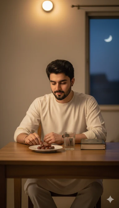IMPORTANT – FACE LOCK (ABSOLUTE & NON-NEGOTIABLE) Keep the subject’s real face exactly identical to the uploaded reference image. Do NOT change facial structure, jawline, eye shape, eyelids, nose, lips, beard pattern, hairline, age, or expression. Maintain 100% identity accuracy at all times. No beautification, no face reshaping, no AI facial modification. Preserve real human skin texture, pores, uneven tone, fine lines, asymmetry, and natural imperfections. Face realism has higher priority than lighting, pose, background, or styling. Face must look raw, natural, DSLR-real, not stylized, not cinematic-art, not AI-generated. SCENE DESCRIPTION Ultra-realistic real-life Ramadan iftar moment, captured like a human-clicked DSLR / smartphone photo, not staged, not cinematic. A young Muslim man is sitting calmly at a simple dining table just before iftar, waiting for Maghrib azan. SUBJECT DETAILS • Same exact face from reference image • Natural beard texture, visible pores • Wearing a simple off-white kurta • Minimal wristwatch only • Hands resting naturally on table • Posture relaxed, slightly leaned forward EXPRESSION & MOOD • Calm, patient, reflective • Eyes softly looking at dates on the table • No smile, no dramatic emotion • Pure Ramadan humility and peace ENVIRONMENT • Modest indoor room • Wooden table • Plate with dates and a glass of water • Small Quran placed beside • Soft warm wall light • Window showing faint crescent moon • No luxury, no decoration overload LIGHTING (REAL HUMAN ONLY) • Soft warm household light • No flash • No studio lighting • Natural shadows under eyes and nose • Real skin highlights only CAMERA & QUALITY • Eye-level angle • Mid-shot framing • Full sharp focus on face • No bokeh • No artificial blur • Slight natural grain • Ultra-HD clarity but raw NEGATIVE PROMPT (STRICT – AI REMOVAL) cartoon, anime, Pixar, CGI, illustration, smooth skin, plastic face, beauty filter, AI face, cinematic glow, unreal lighting, fantasy look, watermark, logo.