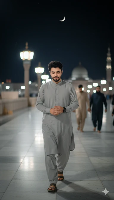 IMPORTANT – FACE LOCK (ABSOLUTE & NON-NEGOTIABLE) Use the uploaded reference image as the only facial identity source. Face must match 100% exactly — zero deviation allowed. No AI enhancement, no beautification, no smoothing. Preserve raw human skin, pores, beard texture, natural asymmetry. Face identity accuracy is more important than pose or lighting. SCENE DESCRIPTION Ultra-realistic Ramadan night street scene, captured like a candid human photo after Taraweeh. A young Muslim man is walking slowly outside a mosque after prayer, hands loosely together, deeply peaceful. SUBJECT DETAILS • Same exact face from reference • Wearing a light grey thobe • Simple sandals • No jewelry except wristwatch • Beard and hair exactly same as reference • Natural walking posture POSE DETAILS • Walking slowly • Head slightly lowered • Hands loosely clasped in front • Body relaxed • No dramatic stance EXPRESSION & MOOD • Peaceful • Content • Spiritually fulfilled • Eyes softly focused downward • No smile, no sadness — pure calm ENVIRONMENT • Mosque exterior street • Soft yellow street lamps • Marble walkway • A few distant people walking • Crescent moon visible • Quiet Ramadan night vibe LIGHTING • Natural street & mosque lights only • Warm highlights, cool shadows • No flash • No studio lighting • Real night exposure CAMERA & QUALITY • Handheld smartphone / DSLR feel • Slight framing imperfection • Face fully sharp • No portrait blur • Natural grain • Looks 100% real NEGATIVE PROMPT (ANTI-AI) cartoon, anime, CGI, illustration, smooth skin, plastic texture, beauty filter, AI glow, cinematic lighting, fantasy style, watermark,